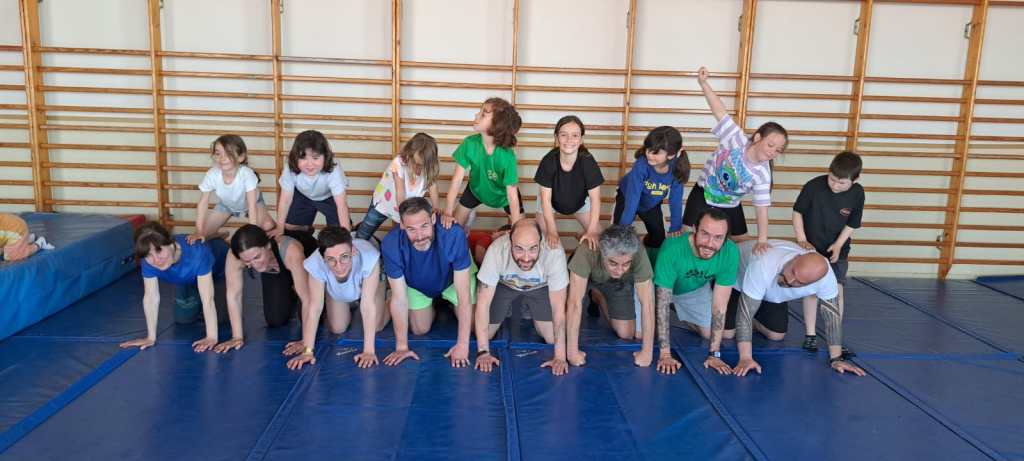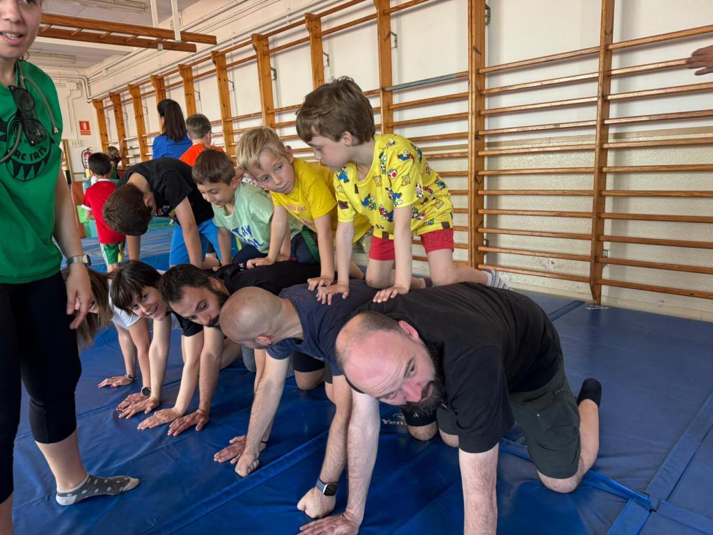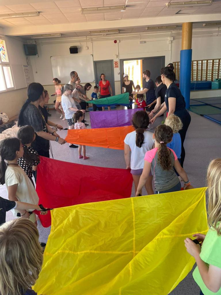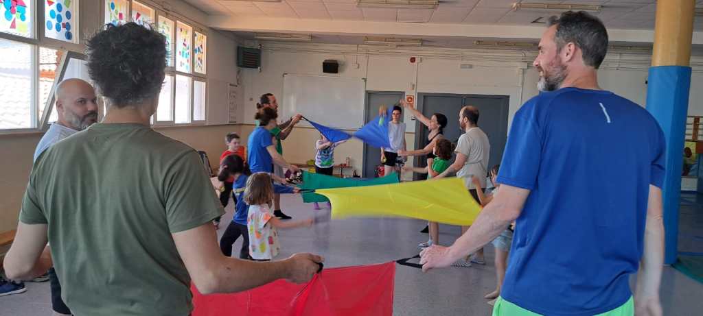 Vam començar amb una mostra de Biodansa, on totes les famílies vam poder gaudir d’uns minuts de dansa tots plegats. Vam continuar amb les activitats dels jocs cooperatius, les famílies estàvem dividides en tres grups, i ens vam dividir en les tres estacions plantejades. La primera estació era el Pitxi, que es va jugar al poli. Al pati de minibàsquet es van fer el joc de la cadena, el d’estirar cues i les rutlles musicals. I al gimnàs es va jugar a pilota i els llençols, a travessar el riu i també a fer figures d’acroesport!