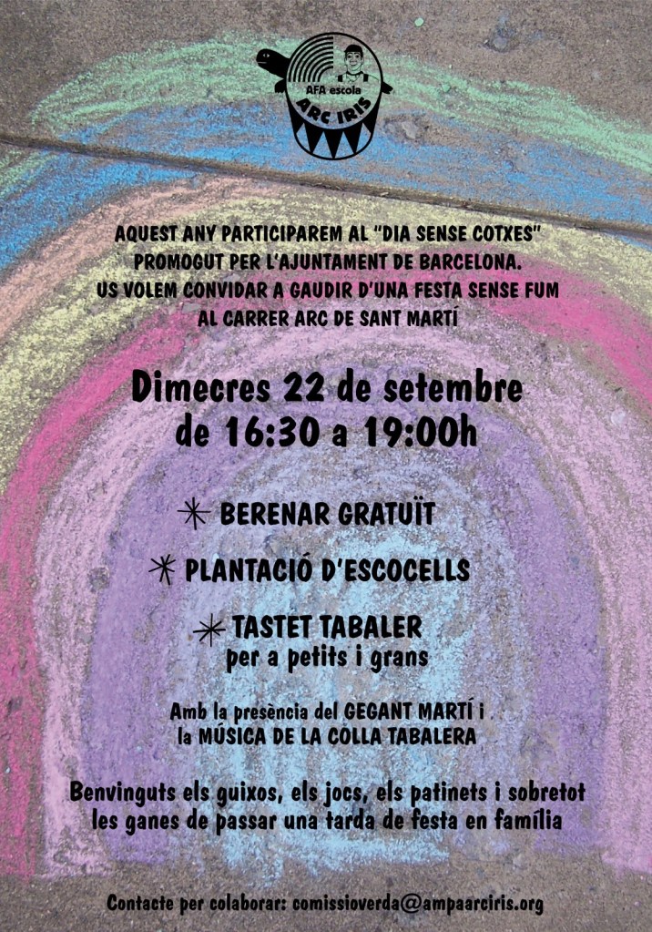 Moltes gràcies a totes les famílies que vau assitir a la Festa “Els Colors de l’Arc Iris Sense Fum” al carrer Arc de Sant Martí!😀🌿🌈 Va ser una tarda genial, petits i grans ho van gaudir molt! Considerar-ho un èxit total i a l’equip directiu de l’escola els hi va agradar molt aquesta iniciativa. Moltes gràcies a tots els que heu ajudat d’una manera o altra, i sobretot als tabalers i al petit però gran equip que ha estat setmanes preparant-ho tot!