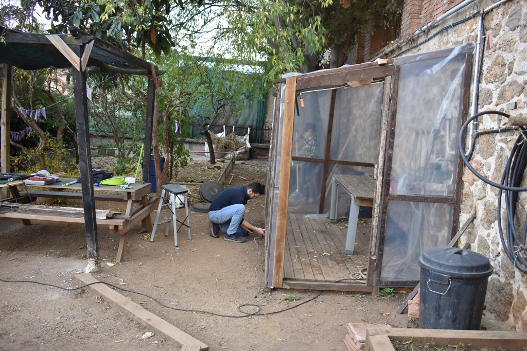 Reparació hivernacle: el Dani va reparar l’hivernacle que estava molt espatllat amb l’ajuda d’altres adults.