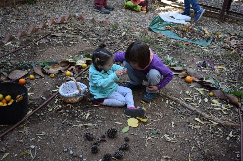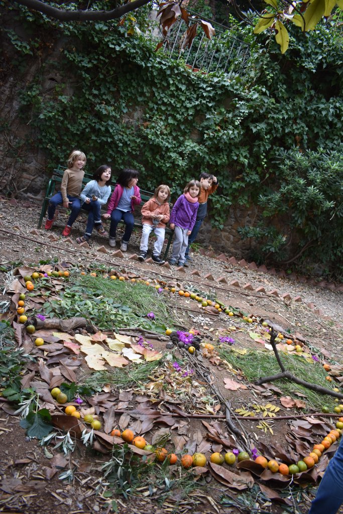 Taller de Land Art. Vam anar a buscar tresors i material natural per l’escola, i vam utilitzar també les plantes que vam treure durant els treballs de jardineria. Vam realitzar una petita obra col·lectiva al jardí de les ombres. Vam xalar molt del procés i del resultat!