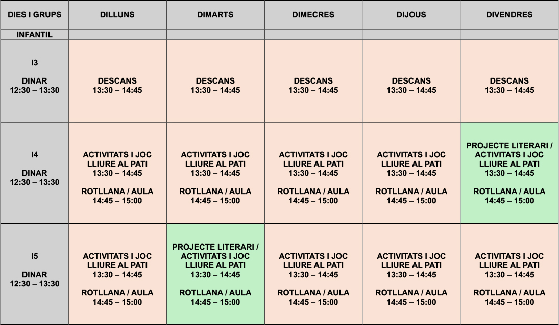 Els nens i nenes d’infantil dinen a les seves aules a les 12.30 h. Els de I3 dormen després de dinar. Aquí podeu trobar més informació sobre el Temps de Migdia a Infantil i aquí sobre el Projecte Literari. Us compartim també el calendari del temps del migdia a infantil aquí.