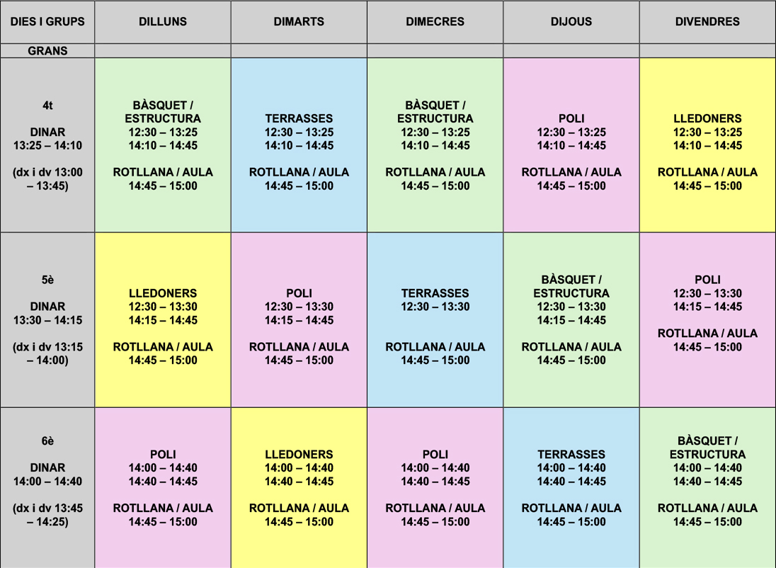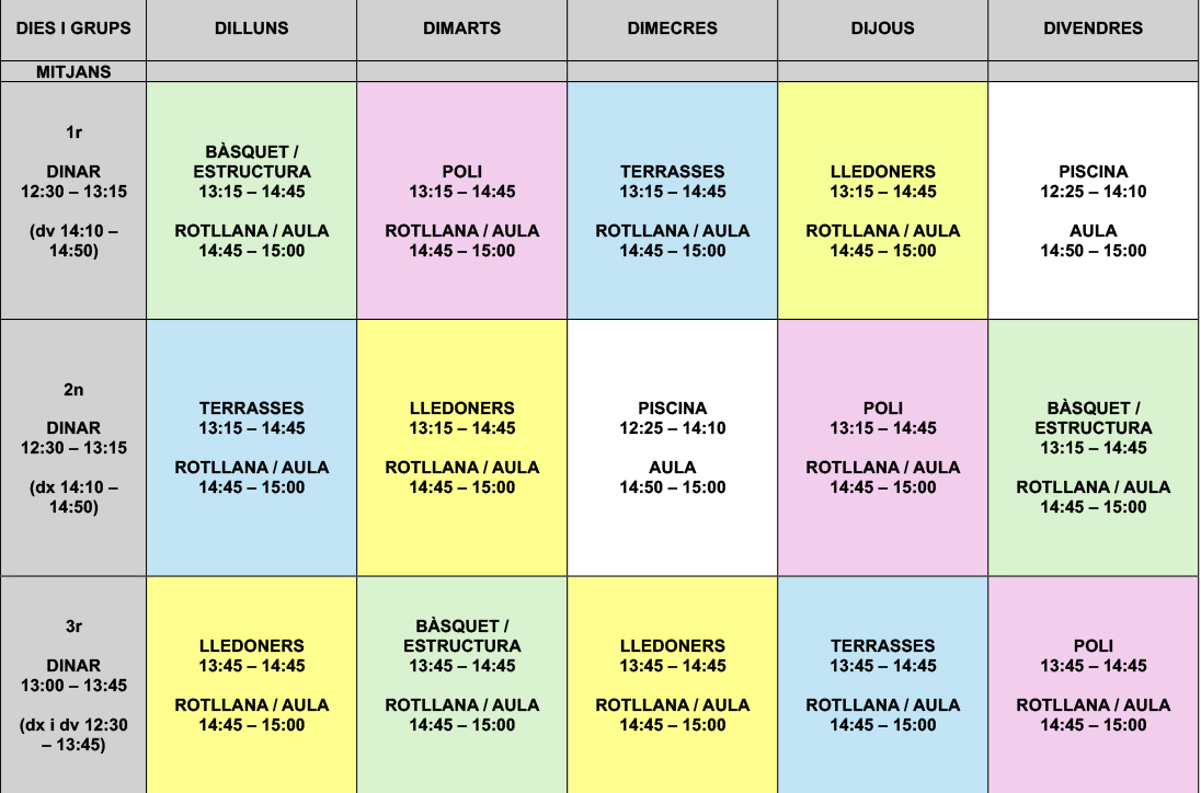 El temps de migdia queda estructurat en dues parts: dinar i activitats lúdiques organitzades o de joc lliure. Les comunitats estaran sempre dividides per grup classe, i tindran assignat un espai per cada dia de la setmana, com alguns grups tenen temps d‟esbarjo després de dinar, aquestes petites estones, poden coincidir dos grups al mateix espai. Aquí podeu trobar el calendari de patis del grup de mitjans i aquí els del grup dels grans.